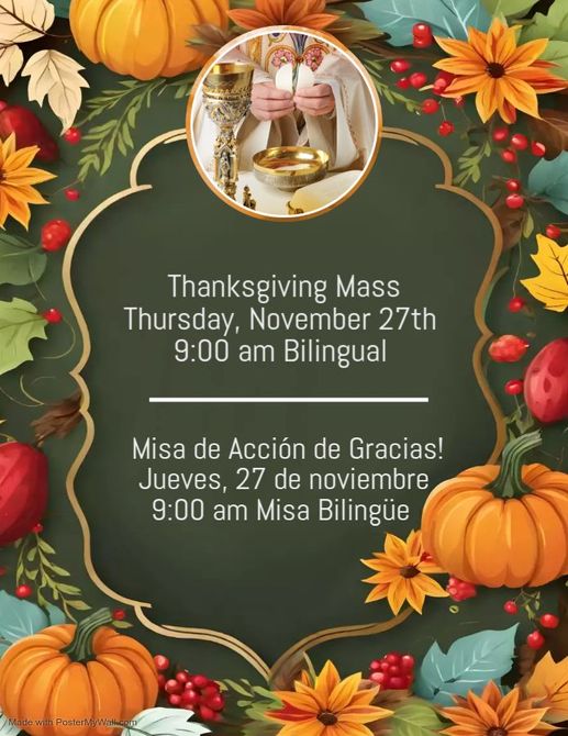 La Oficina Parroquial estará cerrada el jueves 27 de noviembre en observancia del Día de Acción de Gracias. Asimismo, no habrá clases de Educación Religiosa el jueves 27 de diciembre. ¡Les deseamos a todos un bendecido y feliz Día de Acción de Gracias!